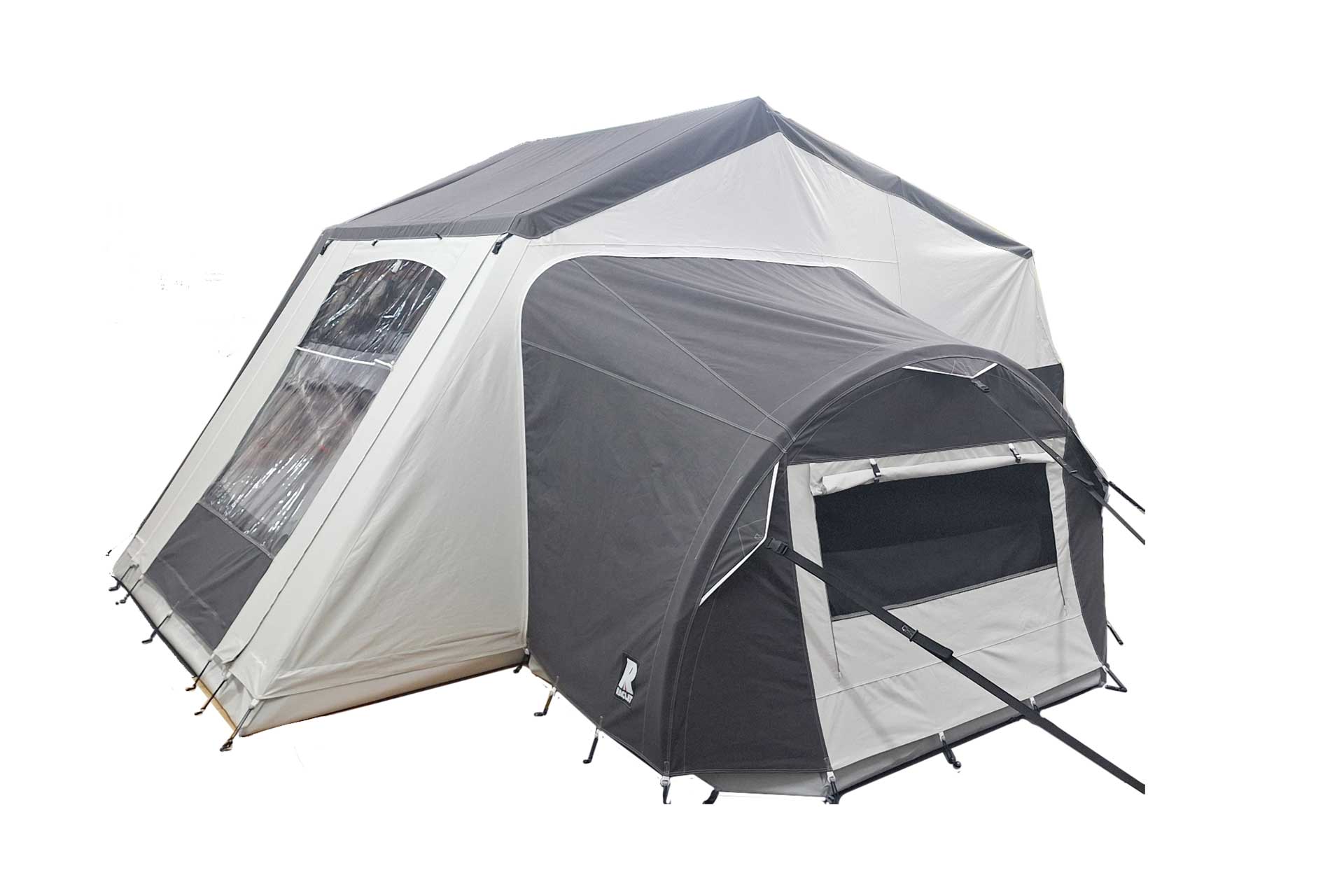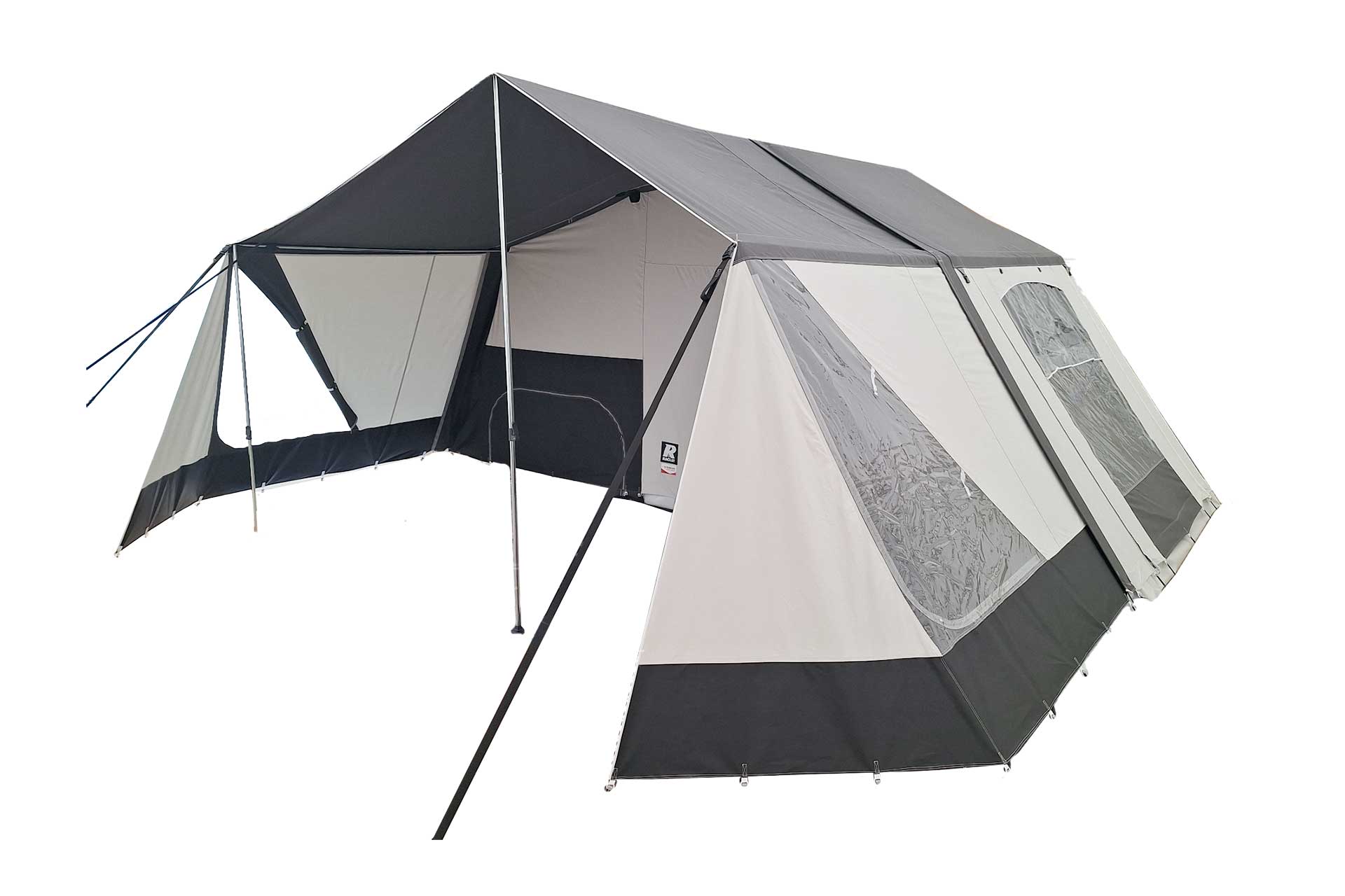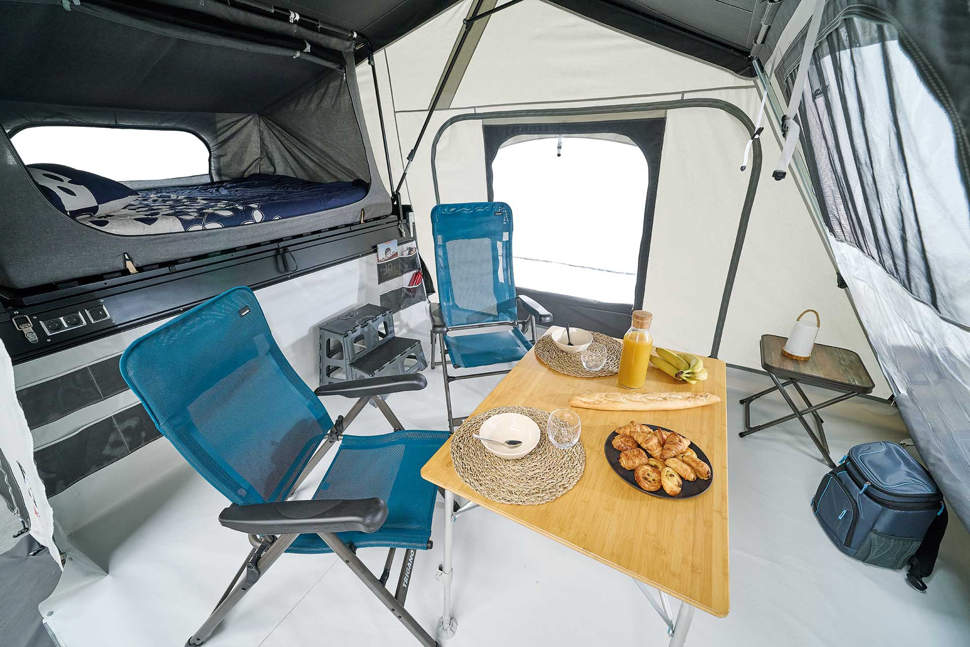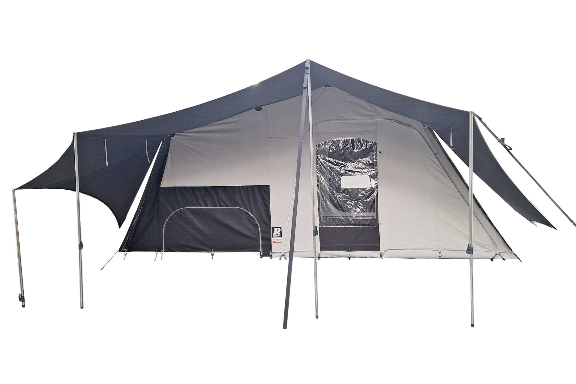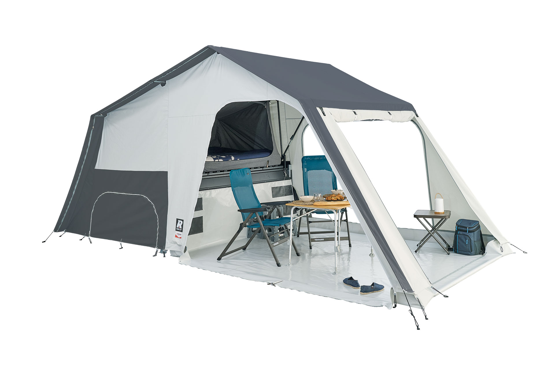 In Minuten entfaltet der Zambesi mit wenigen Handgriffen seine besonderen Stärken. Ein großer Wohnraum mit fester Bodenwanne lädt auch bei regnerischem Wetter zum Wohlfühlen ein. Für bestes Schlafklima sorgt das isolierende und mückendichte Innenzelt der Schlafkabine. Unverzichtbar und natürlich serienmäßig! In Staunen wird Sie der gewaltige Stauraum unter dem Bett versetzen. Platz auch für großes Gepäck! Klare Linien gepaart mit einer asymmetrischen Fensteranordnung geben dem Zambesi ein einzigartiges Design. Das Hauptzelt kann durch ein Sonnensegel (Option) oder ein Vorzelt (Option) für noch mehr Wohnraum erweitert werden. Ein zusätzliches Schlafzelt kann am Hauptzelt angefügt werden. Schlafraum für bis zu 4 Personen. Mit wenigen Handgriffen wird aus dem Zambesi auch ein Transportanhänger!